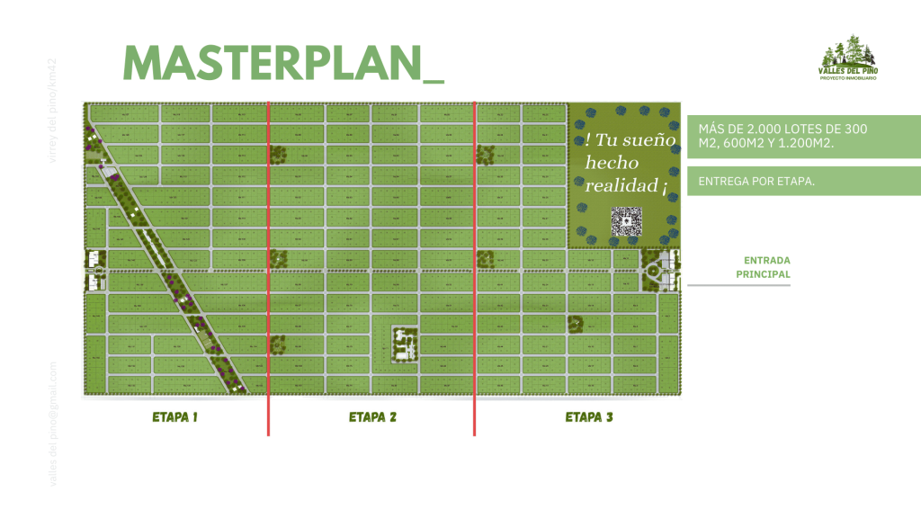 Encontrarás más de 2000 lotes distribuidos en tres etapas. Disponemos de lotes de 300, 600 y 1200 metros cuadrados, adaptándose a todas tus necesidades. Ven y elige el lote perfecto para construir tu hogar en un entorno único y privilegiado.